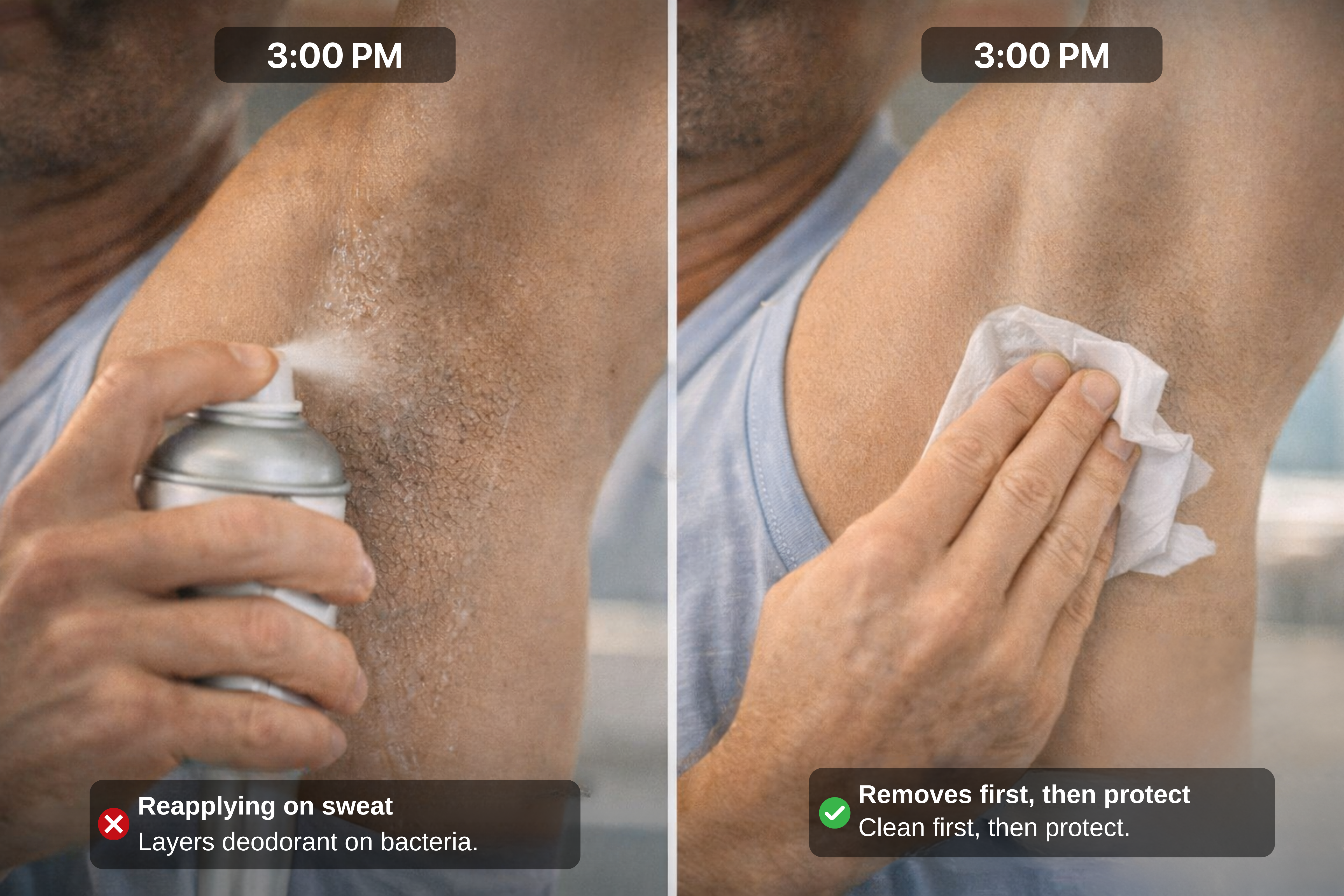 Six months and 47 formulations later, we created what didn't exist: something that removes sweat and bacteria first, then applies fresh deodorant on clean skin.