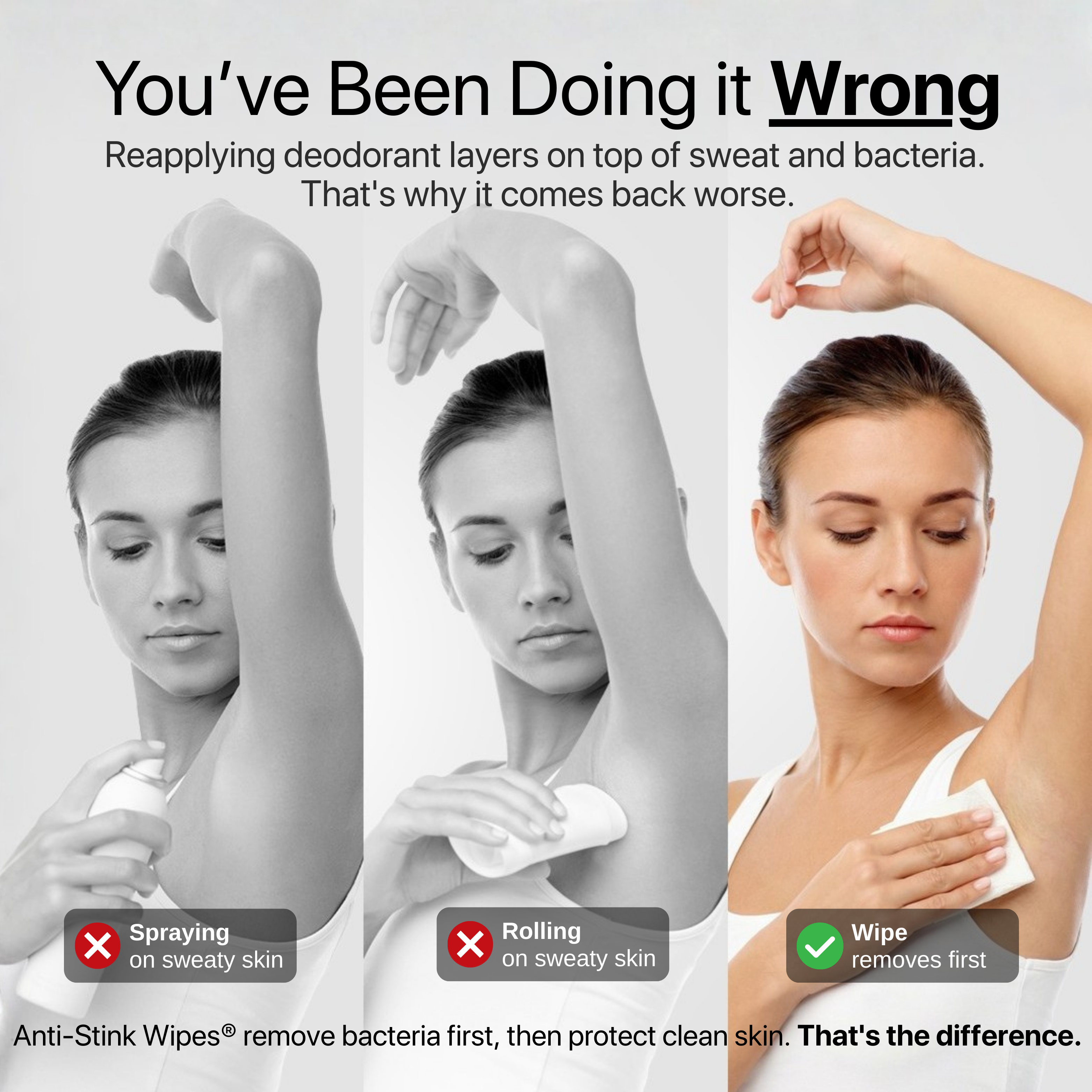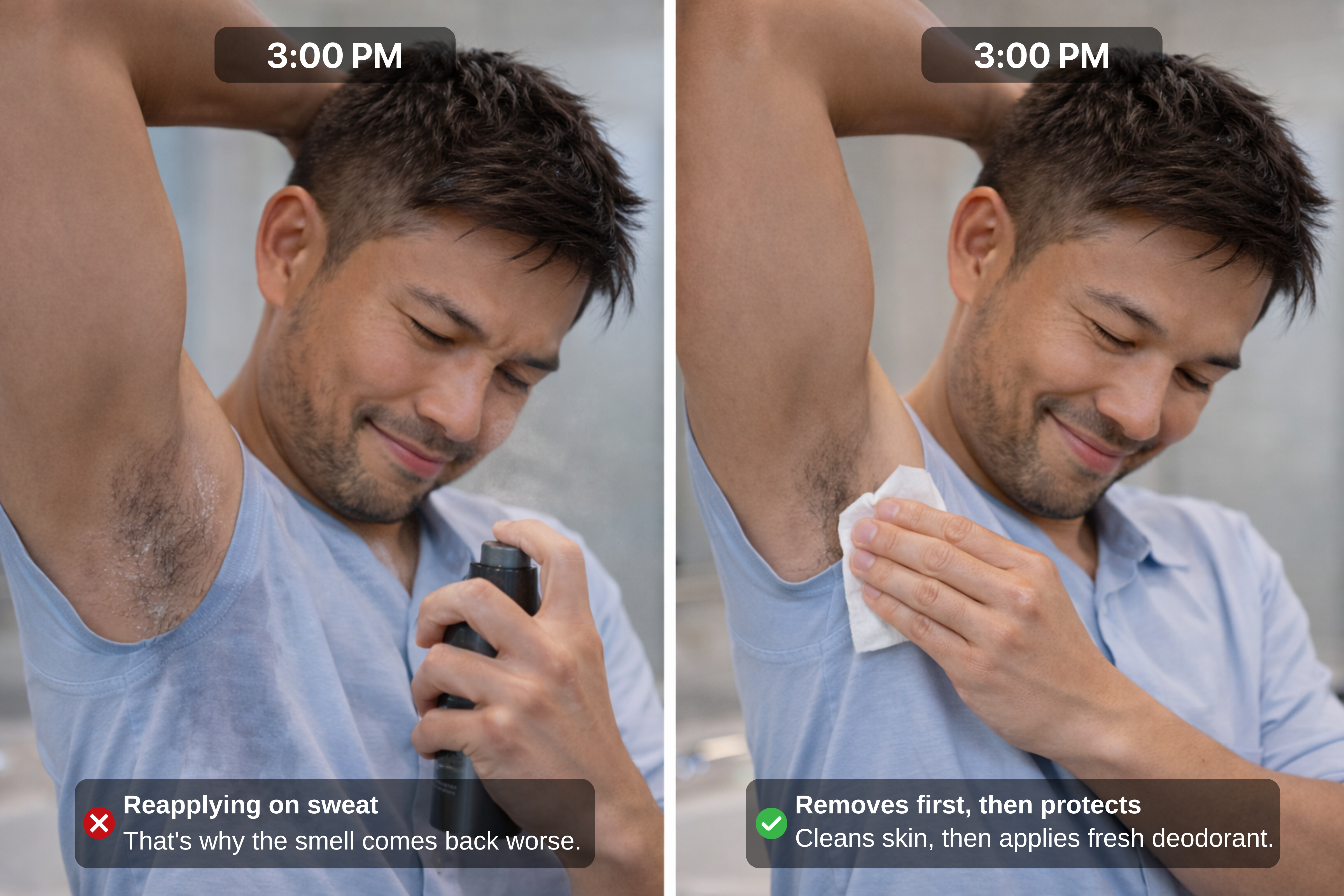 When your deodorant fails, your skin has sweat and bacteria on it. Reapplying just adds fresh deodorant on top of that mess. The bacteria keeps multiplying. The smell comes back worse. Deodorant needs clean skin to work. Remove first. Then protect.