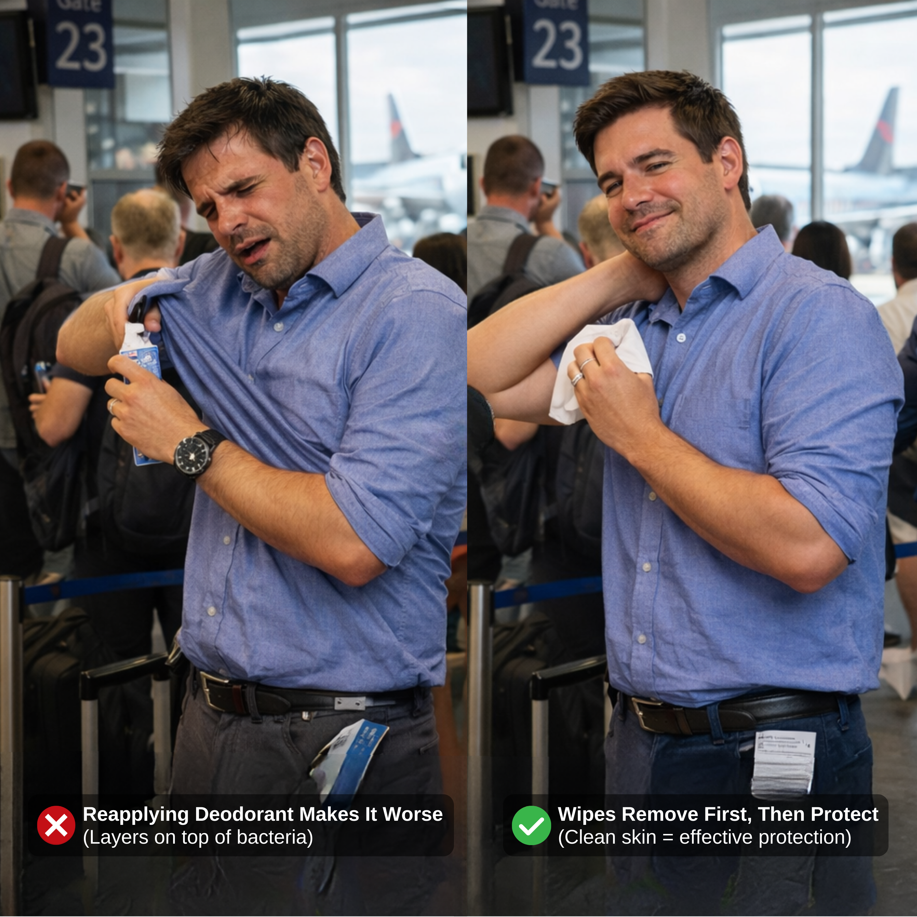Your deodorant worked this morning. Now? It doesn't. So you reapplied. Horrible mistake. You just made it worse. Here's what happened: Your skin has 6 hours of sweat, bacteria, and old deodorant on it. You just sprayed fresh deodorant on top of all that. You didn't remove anything. You layered. That's why the smell came back worse 20 minutes later.